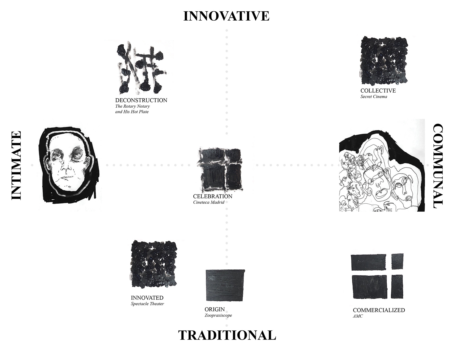 From there, I studied a handful of case studies that embody different settings, typologies, and experiments for consuming film. The study ranged from the traditional AMC Cinema to the contemporary Cineteca Madrid, to the Diller Scofidio experimental performance “the rotary notary and his hotplate, to the pop-up Cinema-performance blend of the Secret Cinema, and finally, the hyper-intimate spectacle theater. Through the studying of these case studies, I began to deepen my understanding of the relationship between the individuals and the screen, the individuals with each other, and the individuals with themselves.